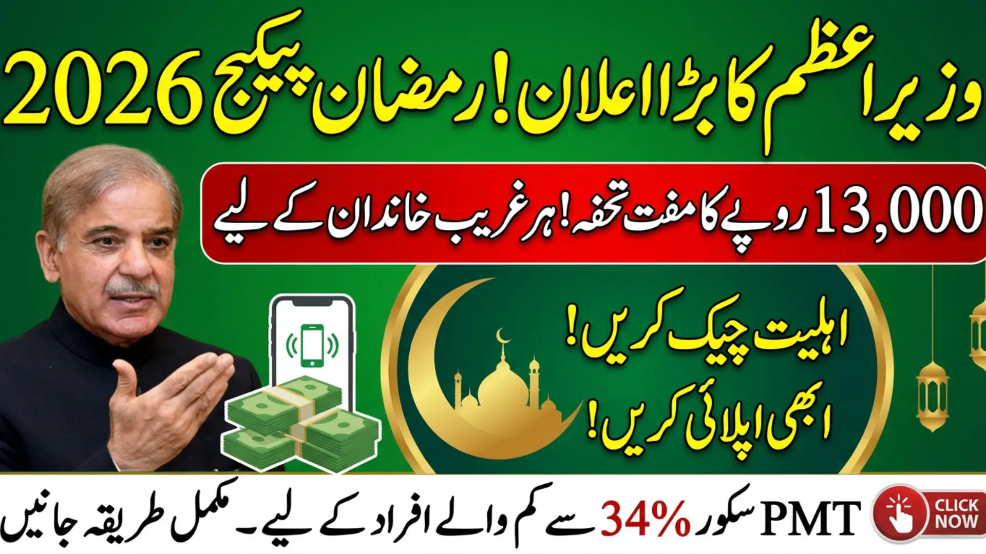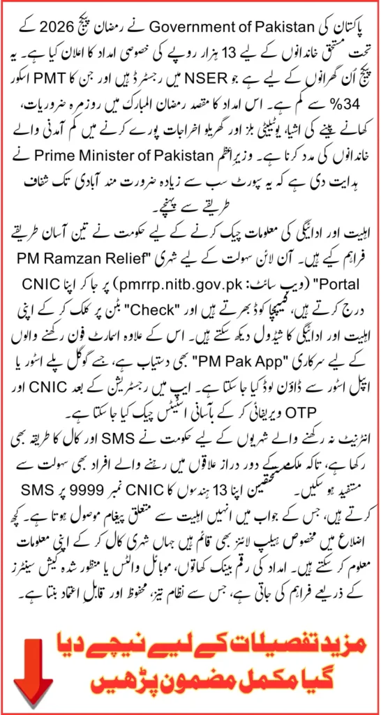 The Government of Pakistan has introduced a special Ramzan Package 2026, providing financial assistance of PKR 13,000 to eligible low-income families across the country. The initiative is designed to help households meet essential needs during the holy month, such as groceries, utility bills, and cooking supplies. The Prime Minister emphasized that this support targets families living below the 34% PMT score, ensuring aid reaches the most vulnerable populations.