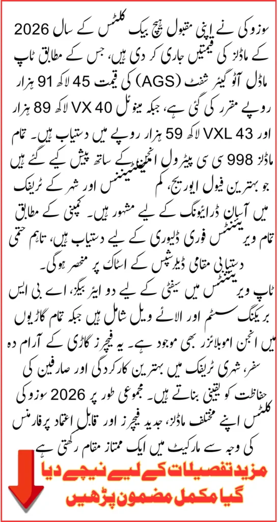 Prospective buyers can now make informed choices based on detailed pricing, features, and variant specifications. The Cultus remains a top choice for urban commuters looking for reliability, efficiency, and comfort in a small hatchback.
