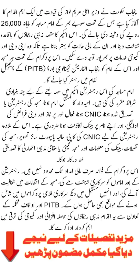 25000 Stipend To 65000 Imam Masjid From 2025: The Government of Punjab, under the leadership of Chief Minister Maryam Nawaz, has introduced a groundbreaking initiative aimed at recognizing and supporting the imams serving across the province. Starting in 2025, every verified imam in Punjab will be eligible to receive a monthly stipend of Rs. 25,000. This effort is part of a broader vision to empower religious leaders, enhance mosque management, and ensure financial stability for those who serve communities selflessly.