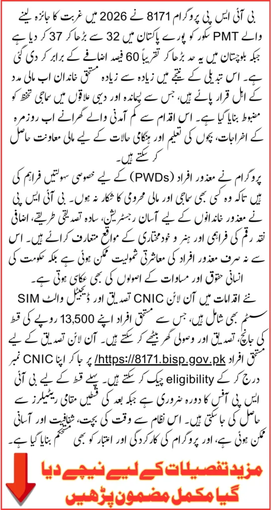 8171 Benazir Income Support Programme 2026: In 2026, the Benazir Income Support Programme (BISP) introduced updated PMT requirements, expanded eligibility, and digital payment solutions to streamline access for eligible families. Code 8171 beneficiaries can now receive a 13,500 PKR installment, check their eligibility online, and withdraw funds using the new digital wallet SIM system.