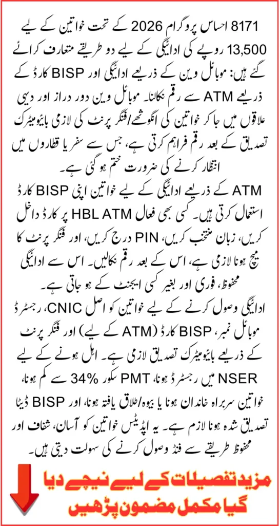 The Government of Pakistan has introduced new methods in 2026 for the collection of 13,500 under the 8171 Ehsaas program 2026. These include the deployment of mobile vans for remote outreach and the use of Ehsaas program-issued ATM cards to make the withdrawal process more accessible and secure. This move is particularly focused on improving financial access for women in rural and underserved areas, who often face challenges in reaching BISP payment centers.