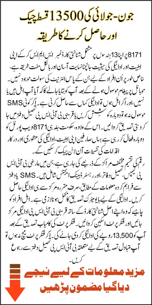 The 8171 Ehsaas Program June–July Payment 2025 is a critical support system for millions of struggling families across Pakistan. With the increased installment of 13,500, eligible individuals can cover basic needs with dignity.