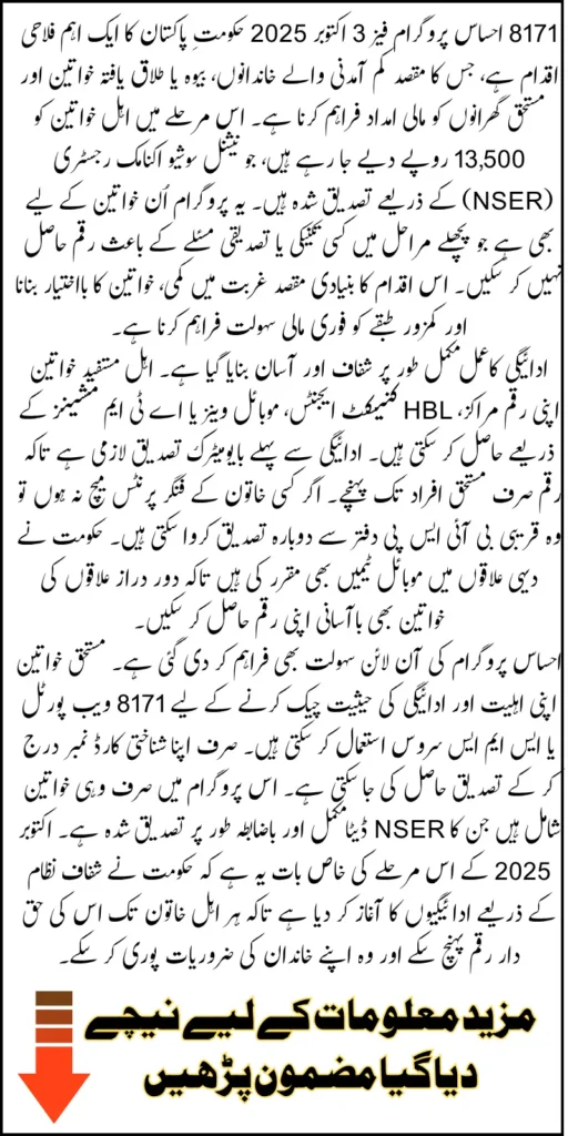 8171 Ehsaas Program Payment Phase 3: The Government of Pakistan has officially launched the 8171 Ehsaas Program Payment Phase 3 in October 2025, aiming to support low-income families who depend on the Benazir Income Support Program. This phase focuses on providing Rs. 13,500 financial assistance to eligible women and families who have already completed their National Socio-Economic Registry (NSER) survey and verified their eligibility status. The goal of this initiative is to reduce poverty, empower women, and ensure that every deserving family receives the financial support they are entitled to.