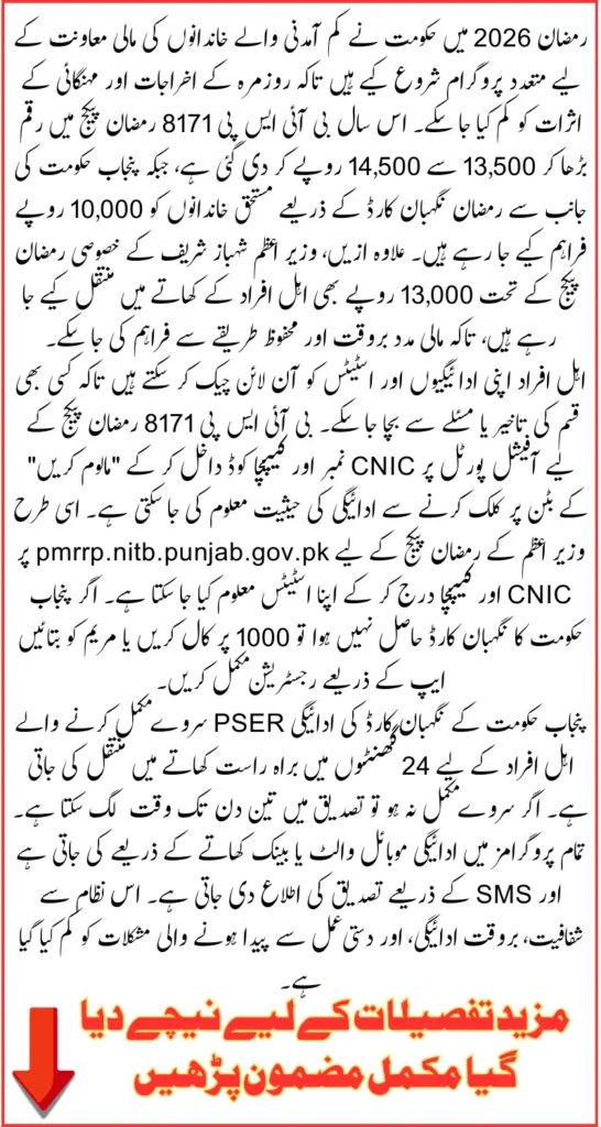 The 8171 Ramzan Package 2026, Punjab Ramzan Nigehban Card, and PM Shahbaz Sharif Ramzan Package provide crucial financial relief to families during Ramadan. By using official portals and apps, beneficiaries can securely receive payments directly into their accounts.