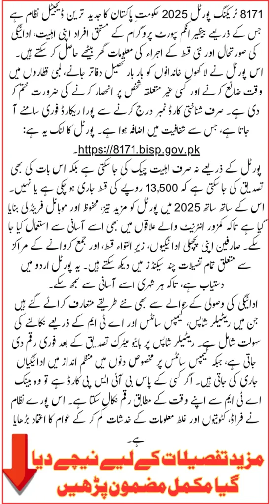 The upgraded portal not only saves time and effort but also eliminates middlemen, ensuring that beneficiaries receive reliable information directly from the official database. With improvements in speed, security, and accessibility, the 8171 system has become an essential service for those relying on BISP support in 2025.