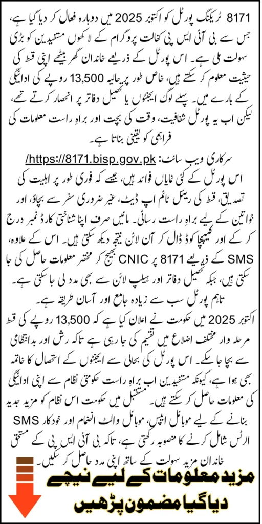 8171 Tracking Portal Restored October 2025: The government of Pakistan has officially restored the 8171 Tracking Portal in October 2025, bringing relief to millions of families who depend on the Benazir Income Support Program for financial assistance. This digital platform allows beneficiaries to check the status of their 13,500 rupees installment online without the need to visit tehsil offices or rely on middlemen. The restoration of this portal is part of the government’s commitment to promoting digital governance, transparency, and accessibility for vulnerable communities.
