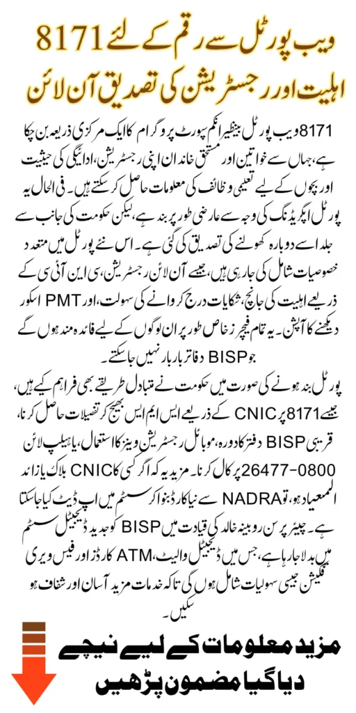 The 8171 Web Portal has become a central hub for beneficiaries of the Benazir Income Support Program across Pakistan. It enables people, especially women in rural areas, to verify their registration, check payment status, and access child support benefits like Benazir Taleemi Wazaif. However, due to ongoing system upgrades, the portal is currently offline, causing confusion among beneficiaries.
