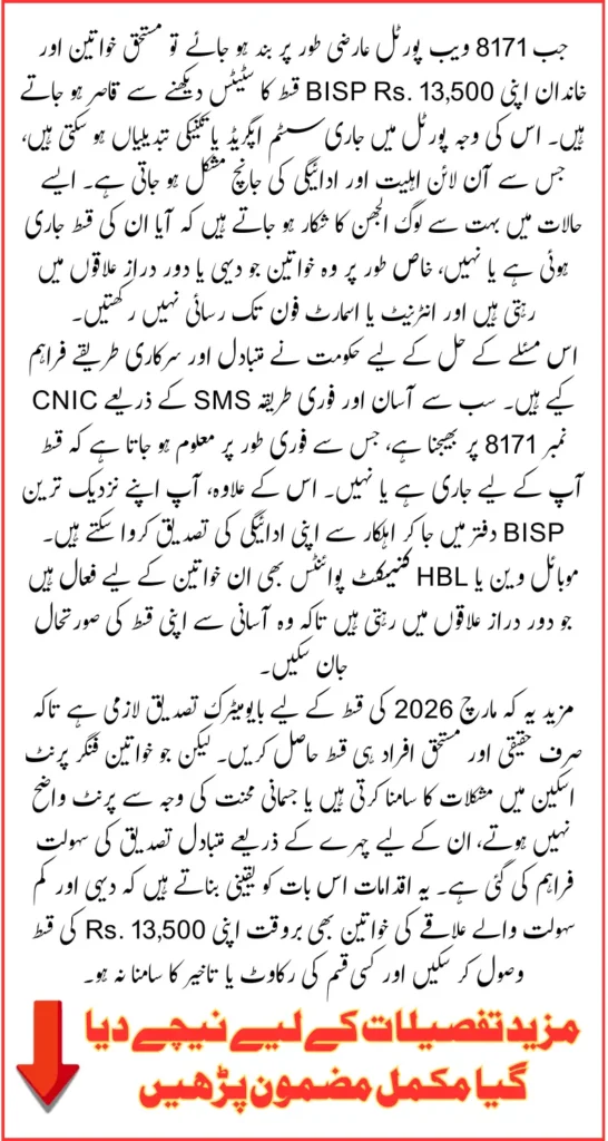 8171 Web Portal Update March 2026: The Government of Pakistan has made a key update to the 8171 web portal in March 2026, which directly affects how eligible beneficiaries can check their BISP 13,500 payment. For years, the 8171 portal has been the primary source for women and families to confirm eligibility, verify payment status, and receive important updates. However, due to an ongoing technical shift and system upgrade, the portal was unavailable and many users are left confused about how to confirm their status for the November installment.