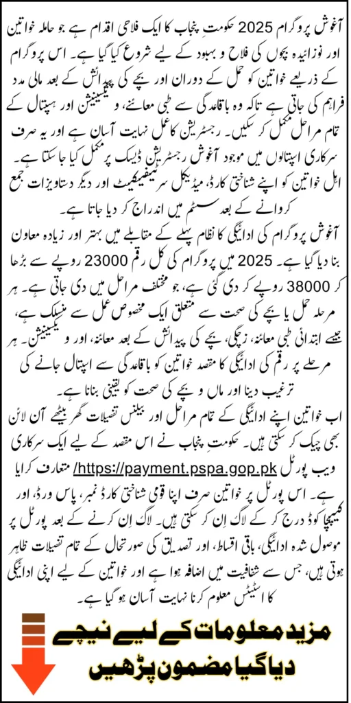 The Aghosh Program, managed by the Punjab Social Protection Authority, connects financial incentives with medical checkups and vaccination schedules. Women who follow the recommended medical visits receive payments in multiple stages during and after pregnancy. The government recently increased the total assistance under this program from Rs. 23,000 to Rs. 38,000, ensuring better financial relief and improved maternal healthcare coverage.