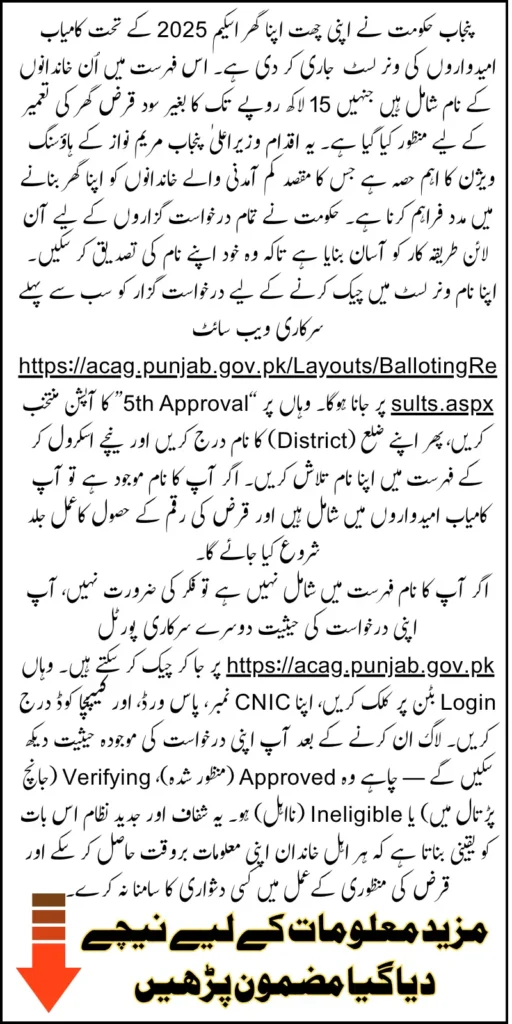 The Apni Chhat Apna Ghar Winner List 2025 represents a major step toward making affordable housing a reality for Punjab’s underprivileged families. Through the Maryam Nawaz Loan Scheme, the government is offering more than just a loan—it is providing an opportunity for dignity, security, and a brighter future.