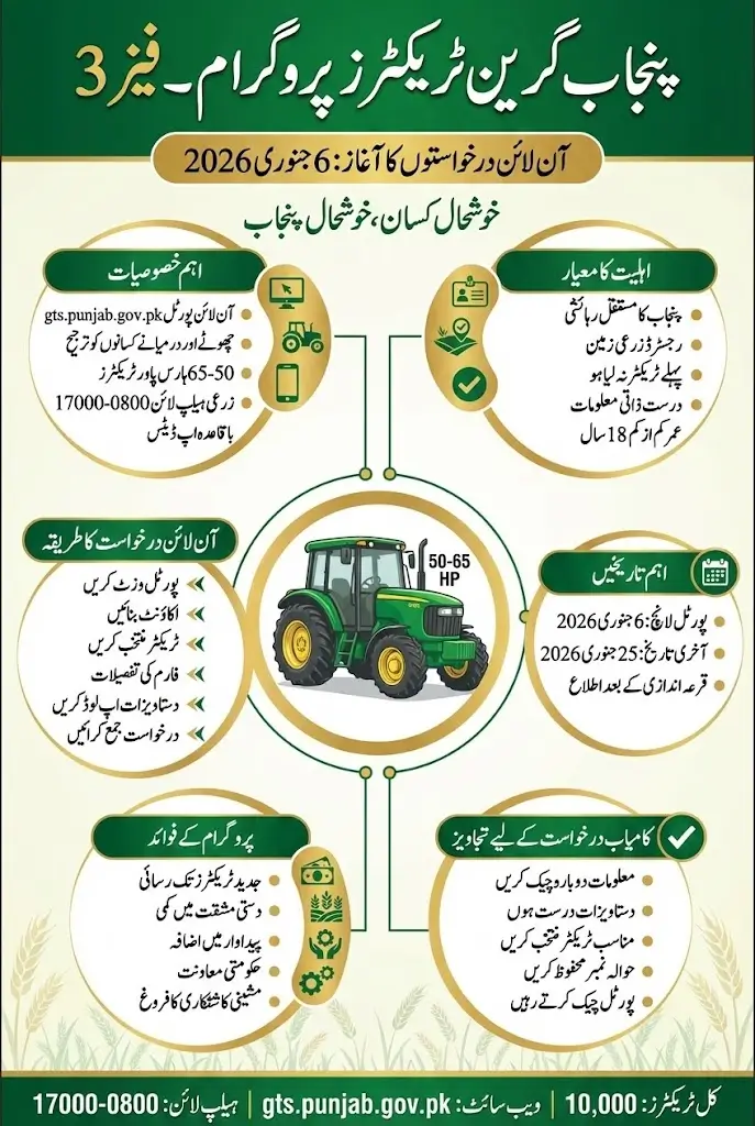 Green Tractor Scheme Phase 3: The Punjab Government has officially started receiving applications for Phase 3 of the Green Tractors Program through the online portal gts.punjab.gov.pk from January 6, 2026. This initiative aims to provide 10,000 modern tractors to farmers across Punjab, to enhance agricultural productivity, mechanize farming operations, and support small and medium-sized farmers under the slogan “Prosperous Farmers, Prosperous Punjab.” The online portal ensures a simple, transparent, and efficient application process for all eligible farmers.