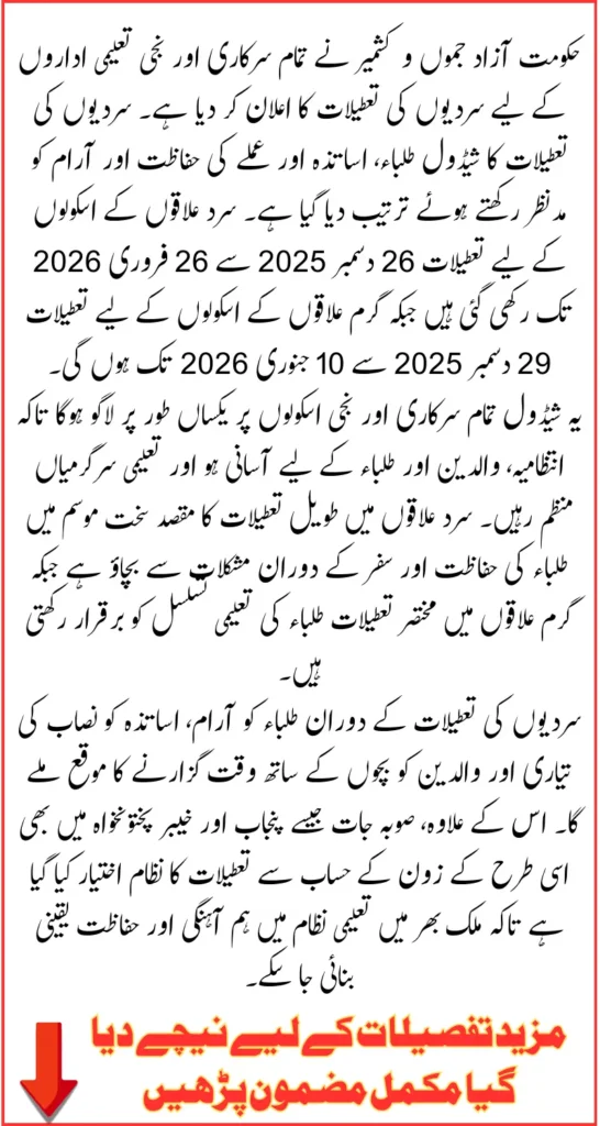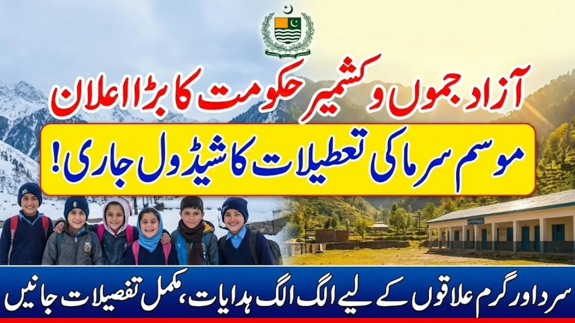 Azad Kashmir Announces Winter Vacations: The government of Azad Jammu and Kashmir has officially announced winter vacations for all public and private educational institutions across the region. This move ensures that students, teachers, and staff have a scheduled break during the harsh winter months, allowing both relaxation and preparation for the upcoming academic sessions. ( Source: Propakistani.pk)