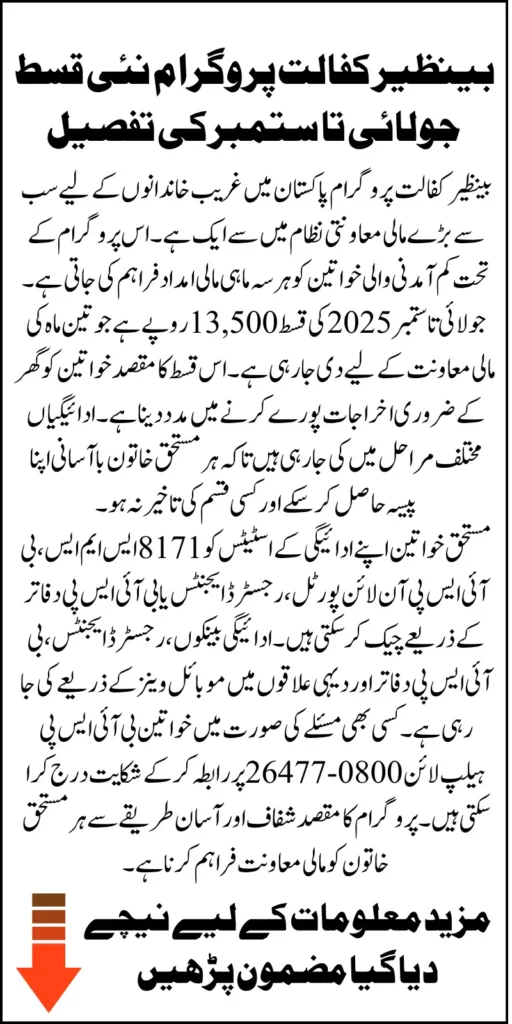 Benazir Kafaalat July-Sept 2025 Payment Updates: The Benazir Kafaalat Program continues to be one of the largest financial support systems for poor families in Pakistan. Under this program, women from low-income households receive financial help every quarter. For the months of July to September 2025, the government has announced a new installment of 13,500 rupees. This guide explains the schedule, eligibility, payment methods, and withdrawal process in detail.