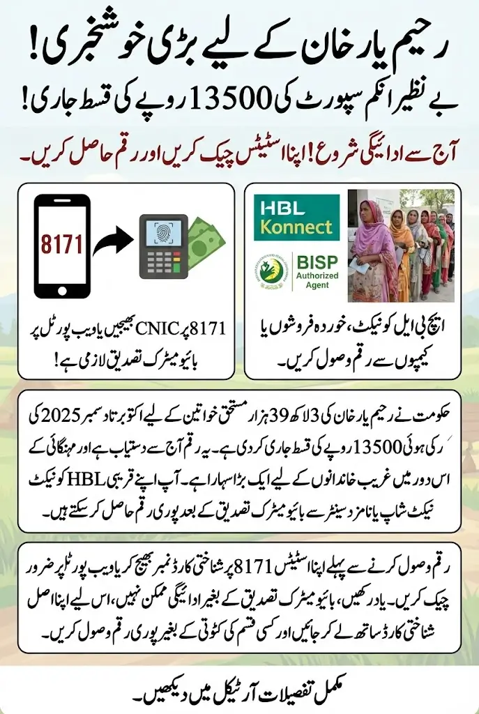 Rahim Yar Khan residents can collect their payments from authorized BISP agents, HBL Konnect shops, and designated collection points within the city. This installment is particularly important because it provides economic support to the “poorest of the poor,” empowering women and ensuring the continuity of household needs during challenging times.