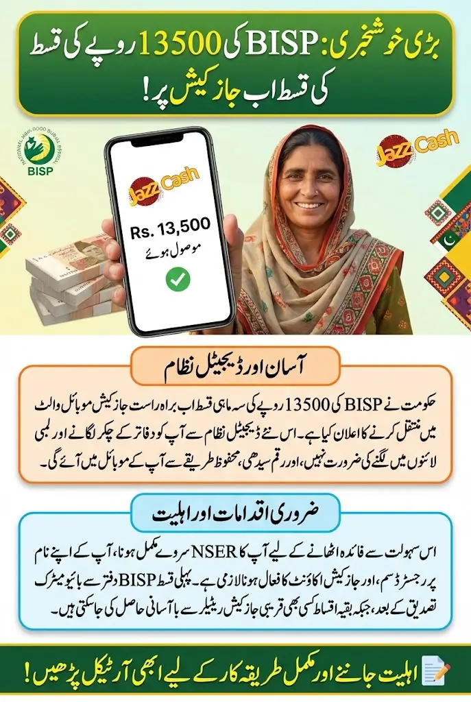 BISP 8171 JazzCash: The Benazir Income Support Programme (BISP) has introduced a fully digital payment system in 2026, enabling eligible families to receive their quarterly payment of Rs. 13,500 directly into their mobile wallets through JazzCash. This modern system eliminates the need to visit cash centers, reduces the risk of fraud, and ensures that the money reaches the deserving families on time. This new method allows eligible beneficiaries to receive their quarterly payment of Rs. 13,500 directly into their mobile wallet, reducing dependency on cash centers and middlemen.