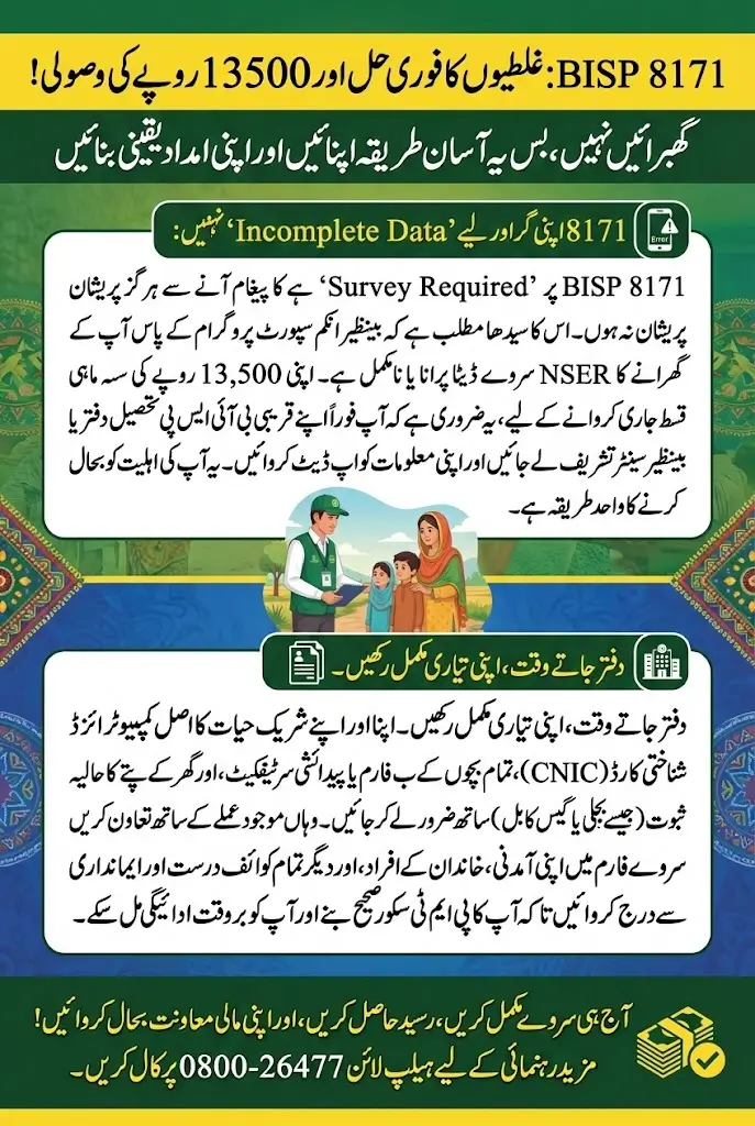 Follow this simple step-by-step guide to fix “Survey Required” or “Incomplete Data” errors in BISP 8171 and ensure your Rs. 13,500 payment without delay.