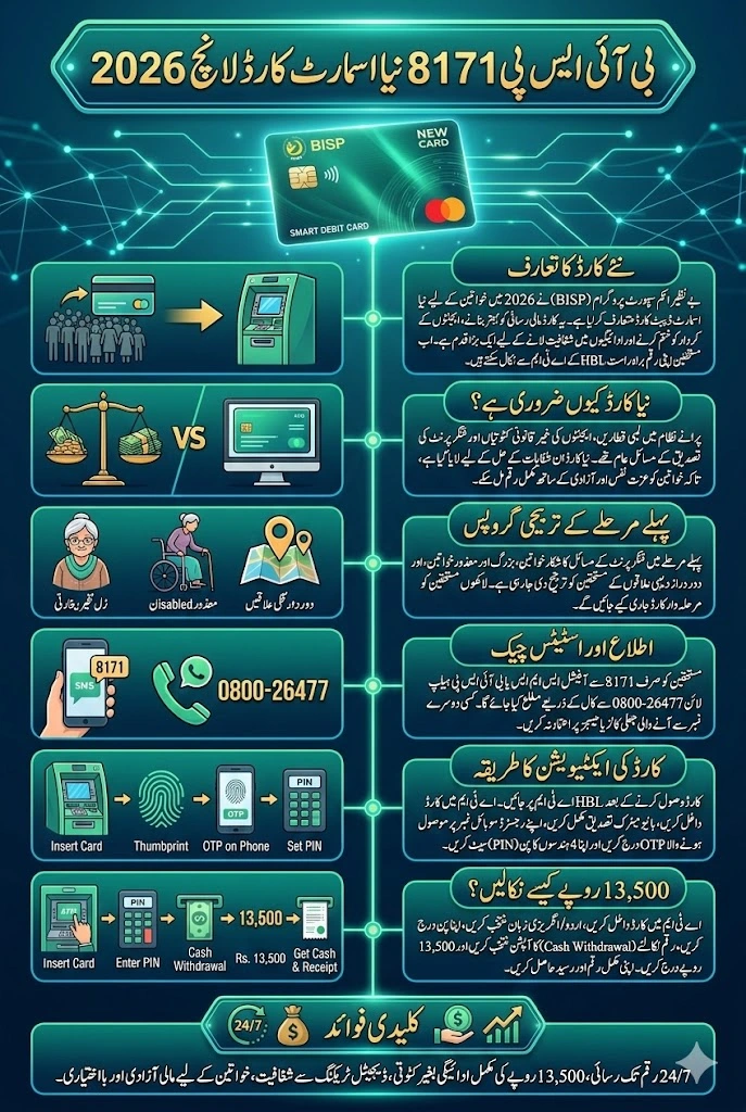 The BISP 8171 New Card Launch 2026 is a turning point in Pakistan’s social welfare system. By shifting from agent-based distribution to a smart debit card system, the program has created a safer, more transparent, and more convenient method for delivering financial aid. Women can now withdraw their full Rs. 13,500 installment directly from ATMs without cuts or delays. The new card not only solves old problems but also empowers women by giving them independence in managing their funds.