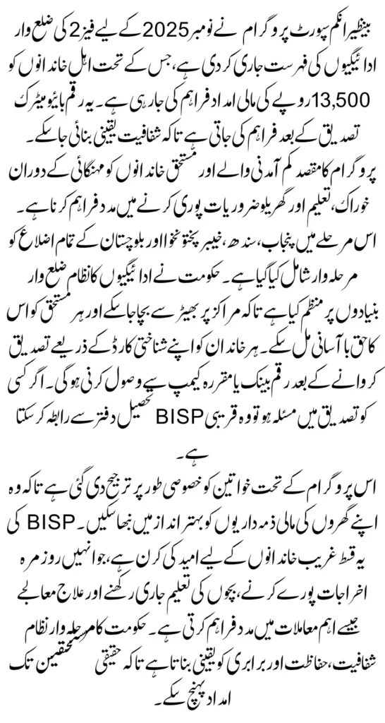 The BISP 8171 November District List 2025 is an important milestone in supporting Pakistan’s vulnerable communities. With payments of Rs. 13,500 distributed through a secure biometric process, the government ensures fairness and transparency at every stage.