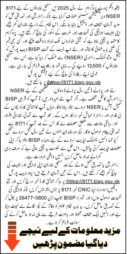 The BISP 8171 NSER Survey Registration and Verification process in 2025 has become more efficient, transparent, and user-friendly. Families can now check their status, complete registration, or verify payments online without unnecessary delays.