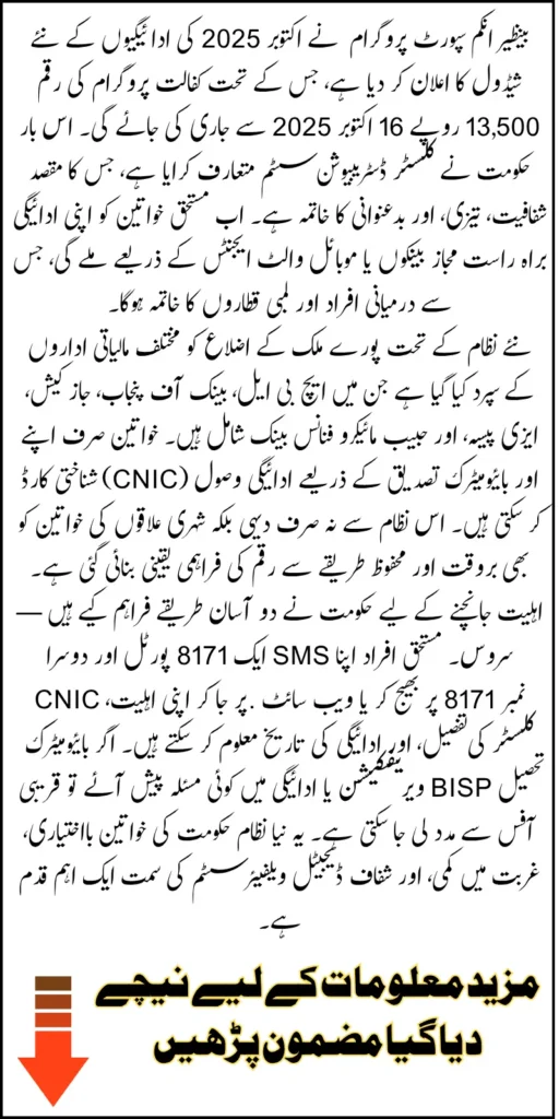 BISP 8171 October 2025 Payment Schedule: The Benazir Income Support Program has released the latest update regarding the October 2025 payment schedule for the BISP 8171 Kafalat Program. This new cycle represents a major step toward digital efficiency and transparency. Payments of Rs. 13,500 will begin from 16 October 2025, ensuring that millions of registered women across Pakistan receive their financial support quickly and securely. The government has introduced a new Cluster Distribution System to eliminate middlemen and long waiting lines, bringing convenience and transparency to beneficiaries in both rural and urban areas.
