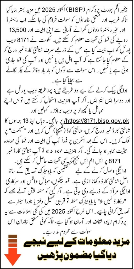 The BISP 8171 web portal in October 2025 has made financial support more accessible, transparent, and efficient. With just a CNIC number, families can confirm eligibility and check their Rs.13,500 installment status without leaving their homes.