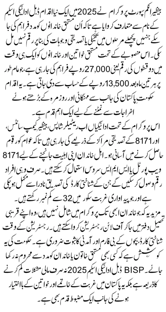 The BISP Double Payment 2025 combines two regular payments of Rs. 13,500 each into one total amount of Rs. 27,000. This initiative was introduced for families who missed their previous installments because of incomplete verification or biometric failures. By merging payments, the government aims to help families manage inflation and meet their daily needs more easily.