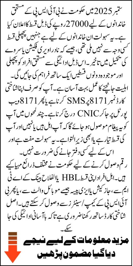 Under normal circumstances, BISP provides one installment every three months. That single installment is 13,500 rupees. In September 2025, the government decided to combine two such installments, resulting in a double payment of 27,000 rupees.