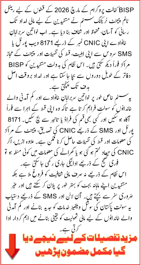 BISP Kafaalat Program Real-Time Payment Tracking: With the March 2026 installment cycles, beneficiaries can now track their payments in real-time using the 8171 web portal or SMS service. This system guarantees transparency, reduces fraud, and allows families to access accurate payment information instantly. The BISP Kafaalat Program is Pakistan’s flagship social safety initiative aimed at providing financial support to the country’s most disadvantaged families. Primarily targeting female heads of households, the program ensures that vulnerable families receive a quarterly stipend to meet their essential needs.