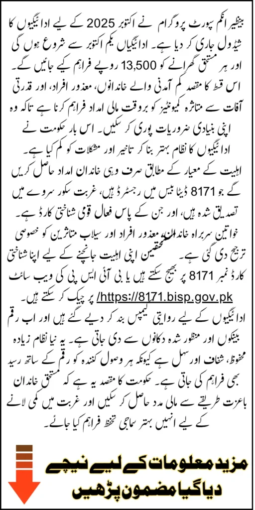 The release of the October 2025 payment schedule brings timely relief for thousands of families. With Rs. 13,500 being disbursed from 1st October, beneficiaries are encouraged to check their status early and collect payments only from authorized shops or banks.