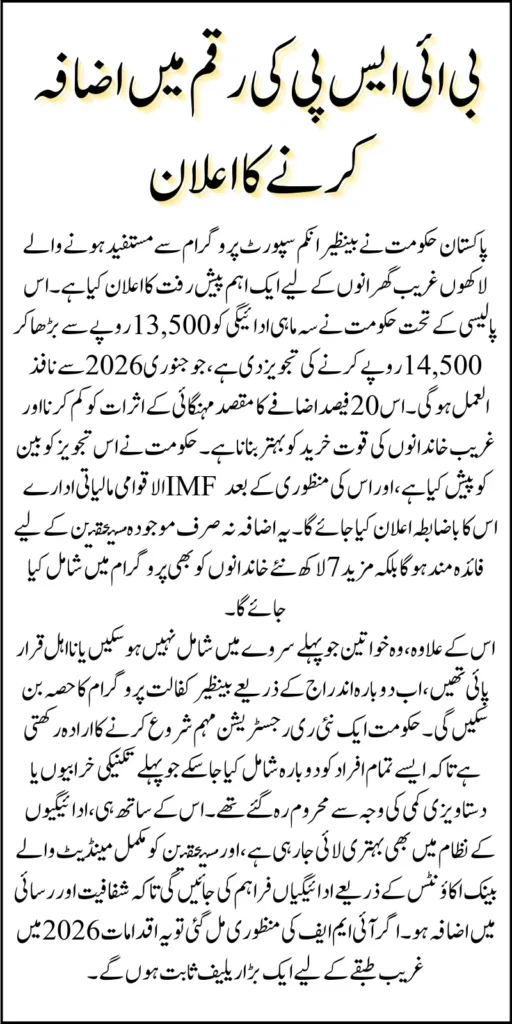The proposed increase in BISP payments from 13,500 to 14,500 reflects the government’s renewed commitment to uplift poor households. If approved by the IMF, it will strengthen the purchasing power of millions of families and expand the safety net to include more deserving people.