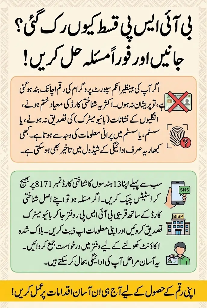 | SMS says “Ineligible” | CNIC expired or unverified | Renew CNIC at NADRA, re-verify at BISP |