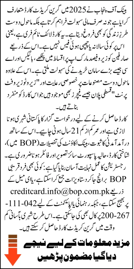 BOP Green Credit Card Lifetime Fee Free: The BOP Green Credit Card 2025 has been launched by the Bank of Punjab as part of its commitment to promoting financial inclusion and environmentally responsible banking. This innovative credit card is designed not only to provide financial convenience to customers but also to encourage sustainable consumption. With features like lifetime free usage, zero-markup installment plans, and eco-friendly product discounts, it represents a modern approach to credit facilities in Pakistan. The card targets individuals who value financial freedom while contributing to environmental sustainability.