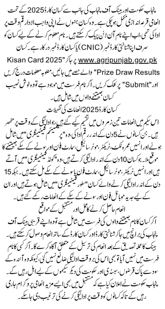 Kisan Card 2025 Prize Winner List: The Punjab Government and the Bank of Punjab have successfully completed the Kisan Card 2025 Prize Draw, bringing excitement and happiness to thousands of hardworking farmers across the province. This program was designed to reward those who made their payments on time under the Chief Minister Punjab Kisan Card 2025 initiative. Farmers who fulfilled their dues within the given deadlines now have the opportunity to check if their names are included in the official Kisan Card Prize Winner List 2025, which is available online.