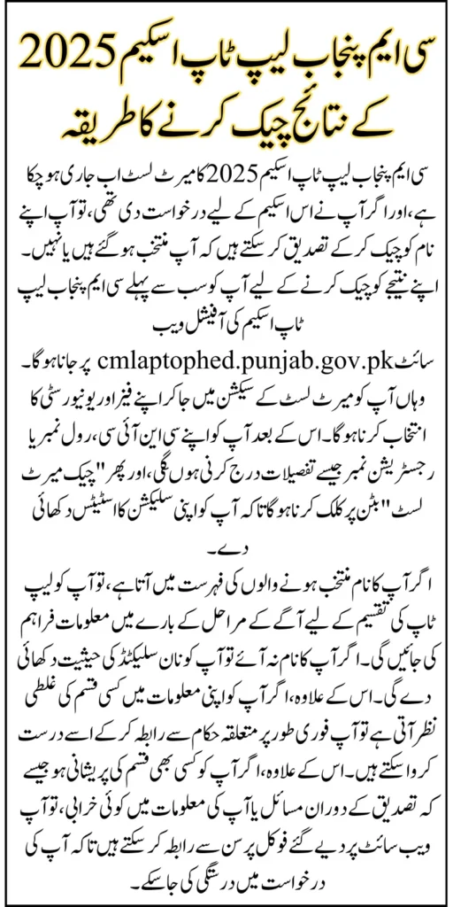 Checking your name on the merit list is an essential step to confirm your eligibility and status. By following the steps outlined in this article, you can easily check your name, understand the selection process, and know what to do next. Make sure to stay updated on the distribution process and ensure all your details are accurate to avoid any issues. If you face any problems, don’t hesitate to reach out for support. The CM Punjab Laptop Scheme is a golden opportunity for students, and it is important to make the most of it to further your education and career.
