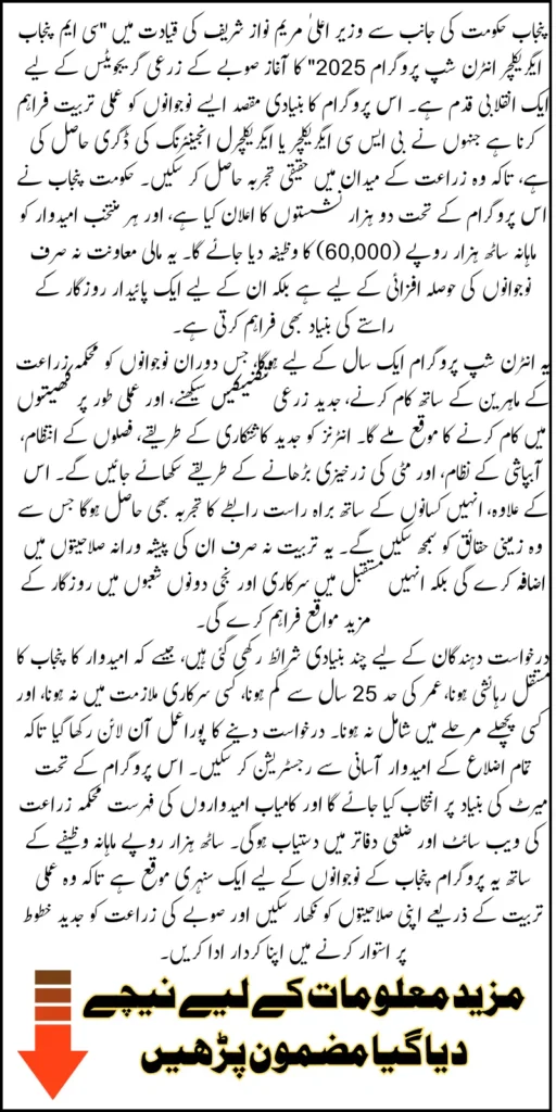 The CM Punjab Agriculture Internship Program 2025 is a landmark initiative that gives young graduates an opportunity to learn, earn, and contribute to the province’s agricultural future. With its combination of financial assistance and skill-based training, it has the potential to transform Punjab’s farming landscape.