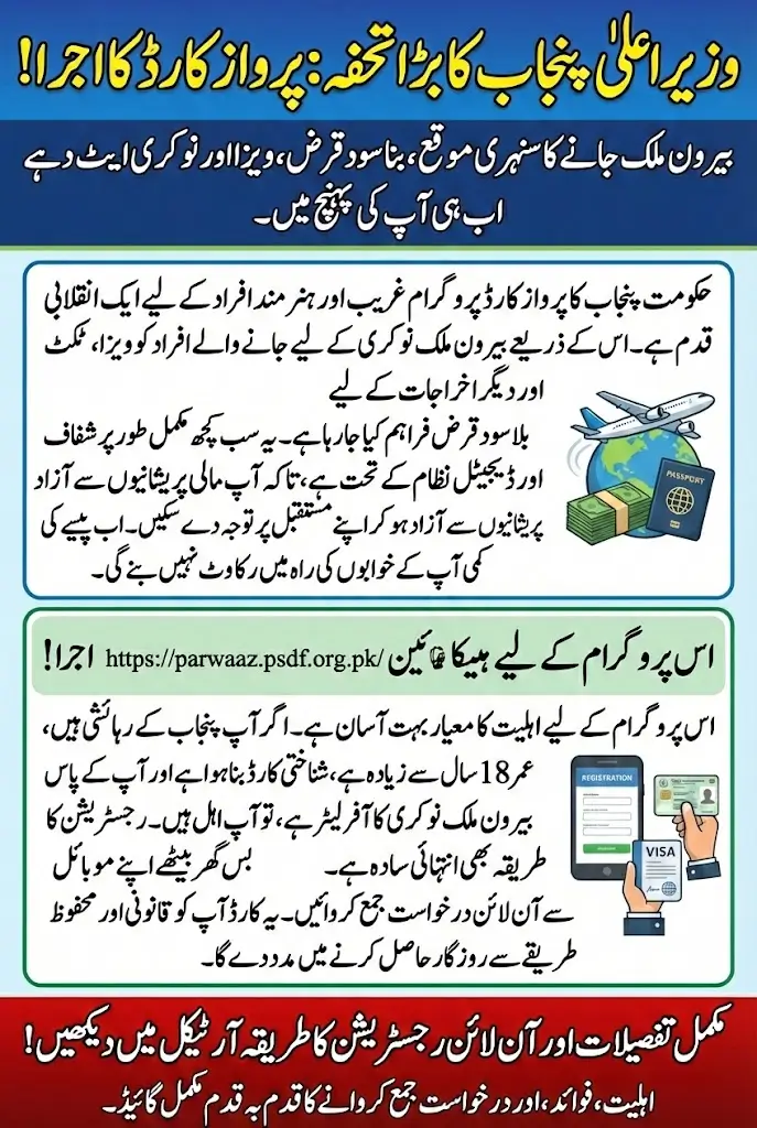 The Parwaaz Card is a government-backed facility designed to help Punjab residents secure overseas jobs by providing interest-free financial support. It focuses on reducing the upfront costs that often stop workers from accepting foreign job offers.