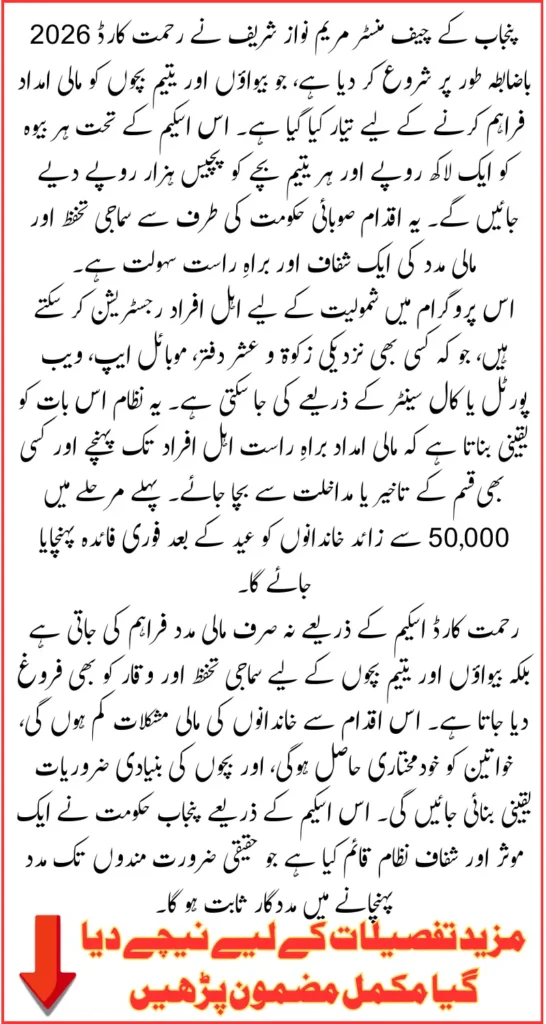 Punjab Chief Minister Maryam Nawaz Sharif has officially approved the “Rehmat Card” scheme, a historic welfare initiative aimed at providing financial assistance to widows and orphaned children across the province. This program is part of the provincial government’s commitment to social protection, ensuring that vulnerable families receive timely and transparent support directly from the state.
