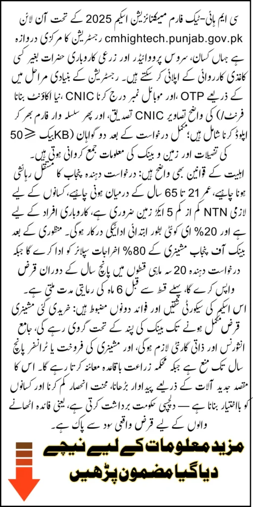 Cmhightech Punjab Gov Pk: The Government of Punjab has launched a revolutionary program under the name CM High-Tech Farm Mechanization Interest-Free Loan Scheme 2025 to modernize agriculture and support farmers across the province. Through the official portal cmhightech.punjab.gov.pk, farmers, entrepreneurs, and service providers can now apply online for loans of up to PKR 30 million without paying any interest. This initiative aims to empower farmers with modern machinery, boost productivity, and reduce dependency on traditional manual farming methods.