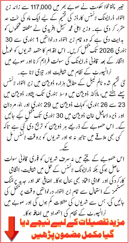 The decision to clear over 117,000 pending driving licences by January 30, 2026, demonstrates Khyber Pakhtunkhwa’s commitment to efficient public service. The division-wise schedule, monitoring mechanisms, and administrative reforms ensure that the backlog will be fully addressed.