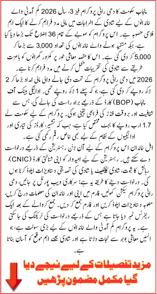 The Dhee Rani Programme phase 3 2026 is a landmark social welfare initiative launched by the Punjab government to provide financial support to underprivileged families during marriage ceremonies. Recognizing the financial strain that weddings often bring to low-income households, this program has been designed to reduce economic burdens and ensure that deserving families can celebrate these important life events with dignity. By providing structured financial assistance, the government aims to foster social inclusion and support families in a meaningful way.