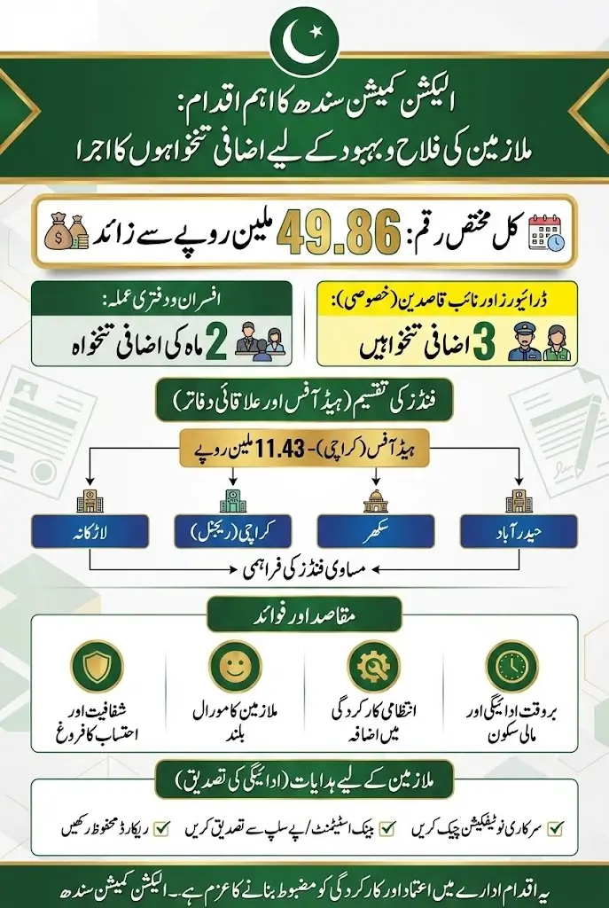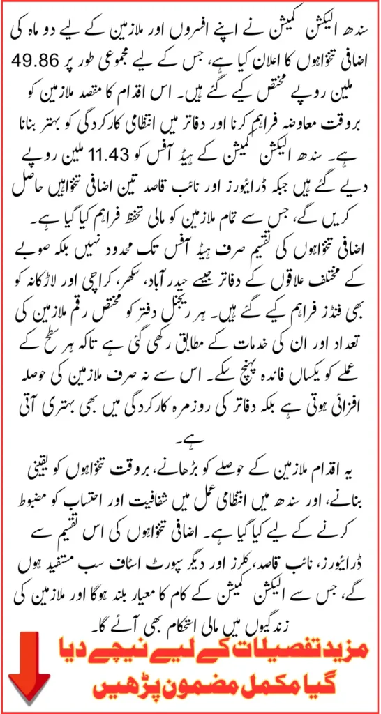 Election Commission of Sindh Releases Over Rs. 49.86 Million as Extra Salaries: The Election Commission of Sindh has taken a significant step to ensure the welfare of its employees by releasing two months’ additional salaries, allocating a total of over Rs. 49.86 million for this purpose. This initiative reflects the commission’s commitment to timely compensation for its officers, staff, drivers, and naib qasids while improving administrative efficiency across the province.