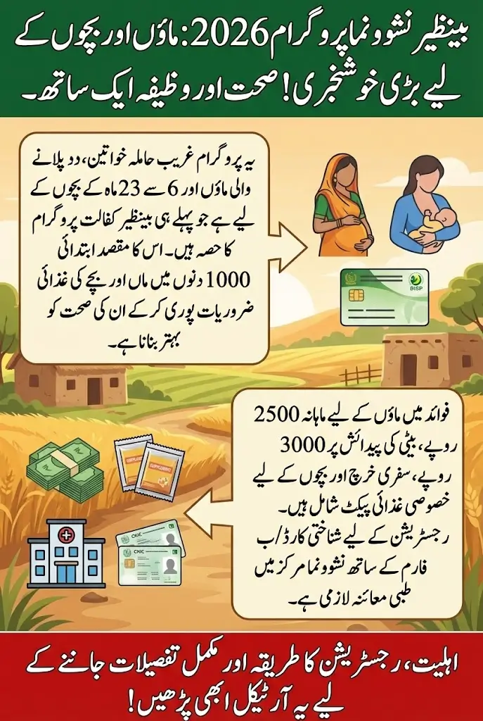 The Benazir Nashunoma Program 2026 is a nationwide social welfare initiative aimed at improving maternal and child health in Pakistan. It specifically targets low-income families by providing nutritional support, financial aid, and medical assistance to pregnant women, breastfeeding mothers, and young children. The program works in conjunction with the Benazir Income Support Programme (BISP), ensuring that benefits reach only eligible families based on verified poverty data.