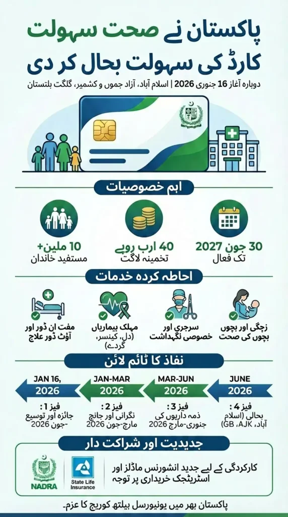 The government has established a clear roadmap for the implementation of the restored Sehat Sahulat Health Card program. Services will be restored in a phased manner, starting from January 16, 2026.