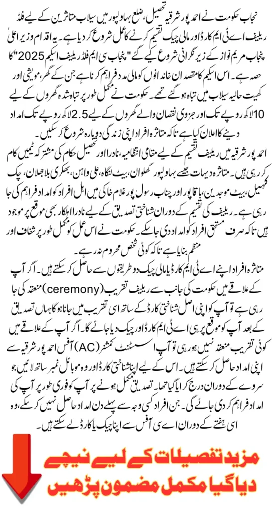 To make the relief distribution easy for all flood-affected residents, the Punjab government has started the delivery of flood relief cheques and ATM cards in Ahmadpur Sharqia. The local administration has arranged proper centers where beneficiaries can receive their financial aid safely and smoothly. The process is being monitored by NADRA and tehsil officials to ensure transparency and fairness.
