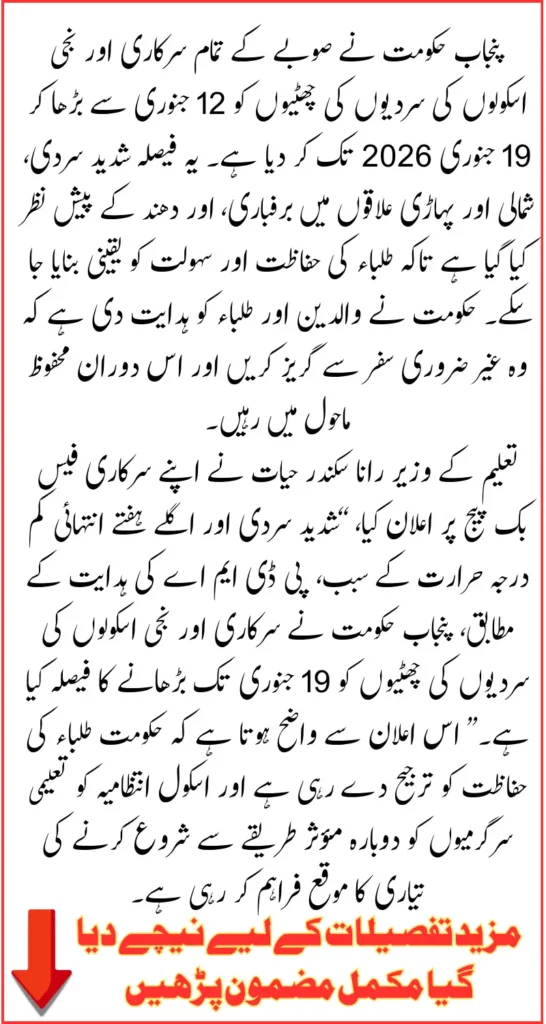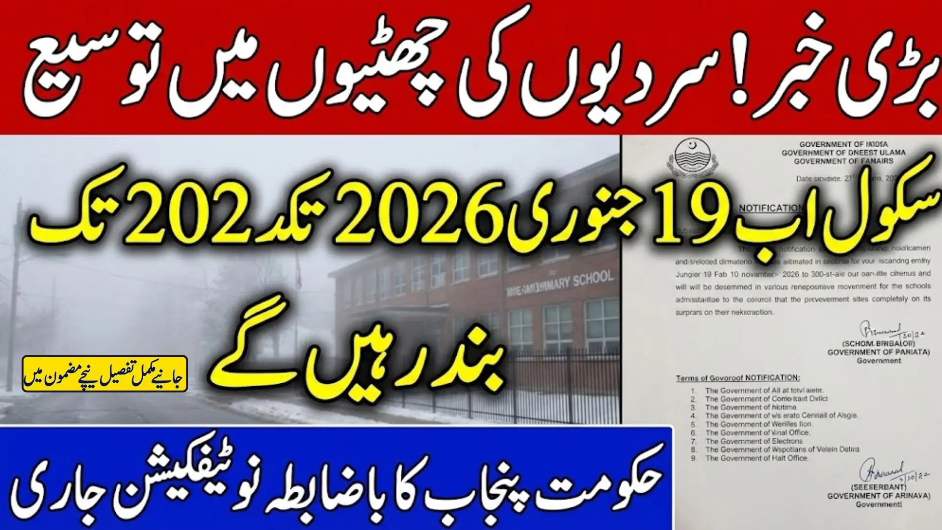 Winter Holidays Extended from January 12 to January 19, 2026: The Government of Punjab has officially announced the extension of winter holidays for schools across the province from January 12 to January 19, 2026. This decision comes in response to extremely low temperatures, heavy snowfall, and dense fog predicted in the upcoming week. The extension aims to ensure the safety and well-being of students while minimizing disruptions caused by adverse weather conditions.