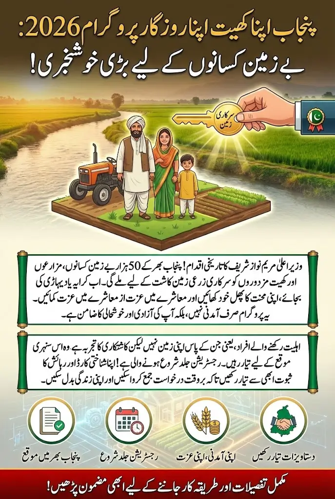 The Punjab Apna Khet Apna Rozgar Program 2026 is a landmark initiative aimed at transforming the lives of 50,000 landless farmers across the province. Launched under the leadership of CM Maryam Nawaz Sharif, the program provides government-owned agricultural land to tenants and farm laborers, enabling them to cultivate crops under their own name and secure a stable source of income. This program not only focuses on income generation but also empowers farmers with social respect, economic independence, and long-term rural development.