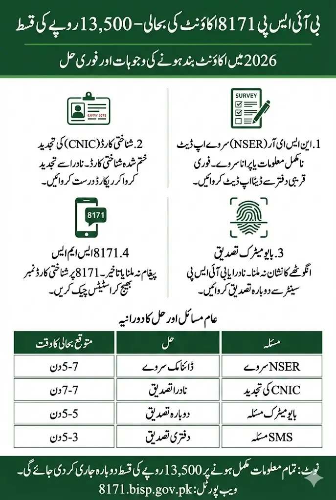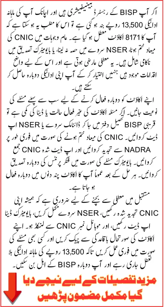 Having your BISP 8171 payment suspended can be stressful, but following the correct procedures ensures a quick solution. Addressing issues such as inactivity, expired CNIC, biometric failures, or SMS delays can restore your monthly payment efficiently.