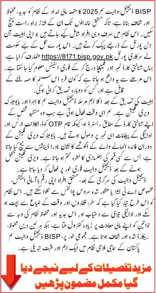 Activation of the digital wallet requires biometric verification at an official BISP office or campsite. Only after successful verification can the wallet be used to receive payments, access alerts, and perform withdrawals. This step-by-step guide explains how to check eligibility online, activate the SIM, complete biometric verification, and use the digital wallet for receiving funds.