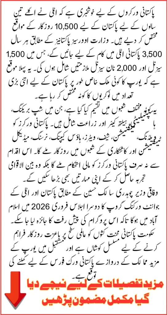 The allocation of 10,500 jobs by Italy to Pakistani workers over the next three years is a historic development that will benefit thousands of families, enhance skills, and strengthen Pakistan’s workforce. The structured distribution of seasonal and non-seasonal positions ensures balanced opportunities across sectors and years.