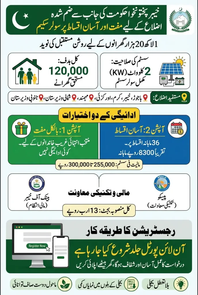 The Khyber Pakhtunkhwa government’s free and affordable solar scheme is a landmark initiative to provide energy access to 120,000 households in selected districts. With online registration launching soon, eligible families can easily apply for solar systems and benefit from sustainable electricity.